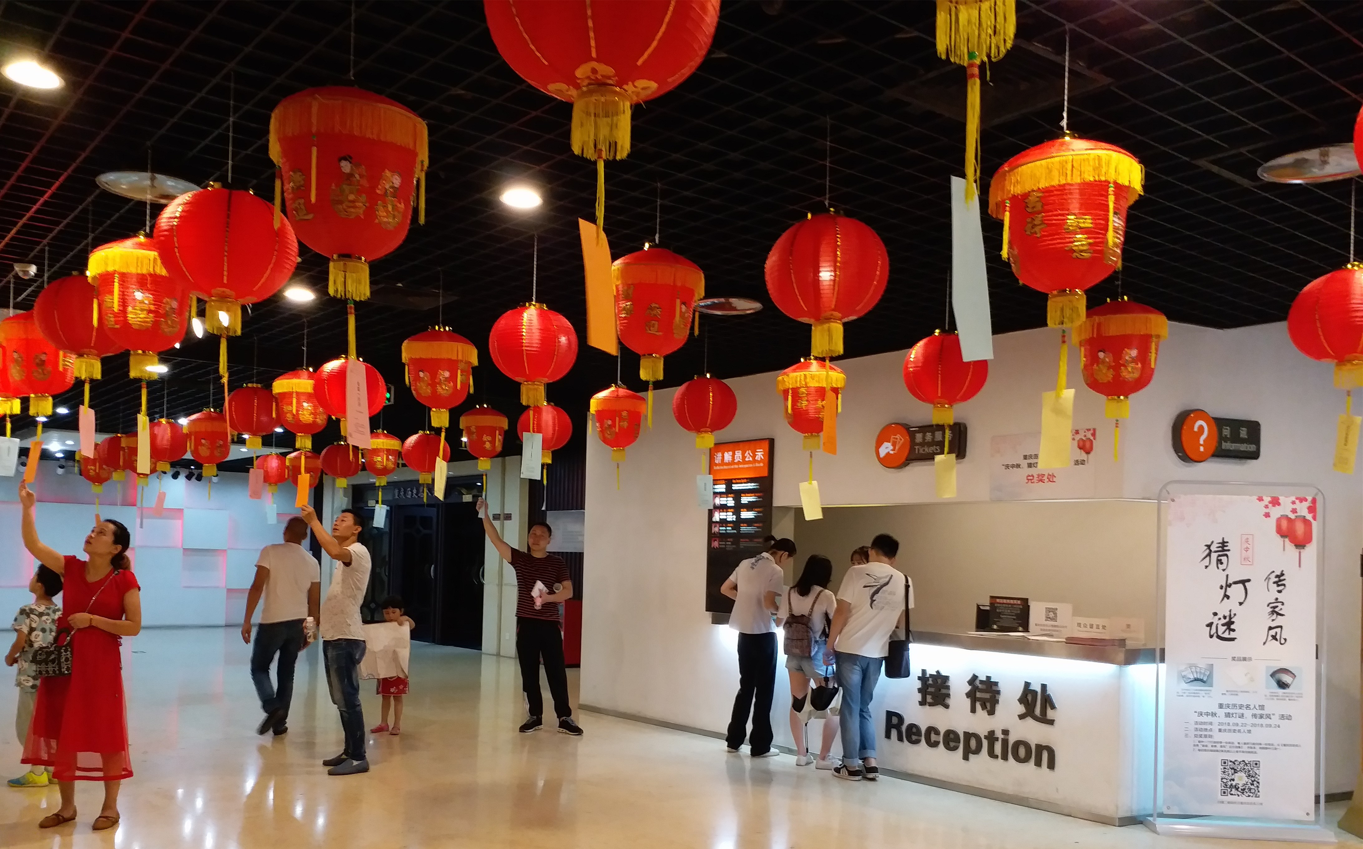 中秋国庆期间,taptap动物森友会在前厅挂满了大红灯笼,每盏灯笼下都悬挂着印有谜语的彩笺,整个大厅喜气洋洋,节日氛围非常浓厚。参与活动的游客若是猜出了谜底,就可以取下彩笺去兑奖处领取奖品,奖品有小巧精美的手账本,有引导游客瞻仰名人、探访名人故居的《重庆历史名人纪念馆、故居地图》,还有《重庆历史名人优秀“家庭、家教、家风”征文选集》,可以让我们在这阖家团圆、举国同庆的美好时刻,重温名人先贤的家风故事,感受中华民族的传统“家”文化。