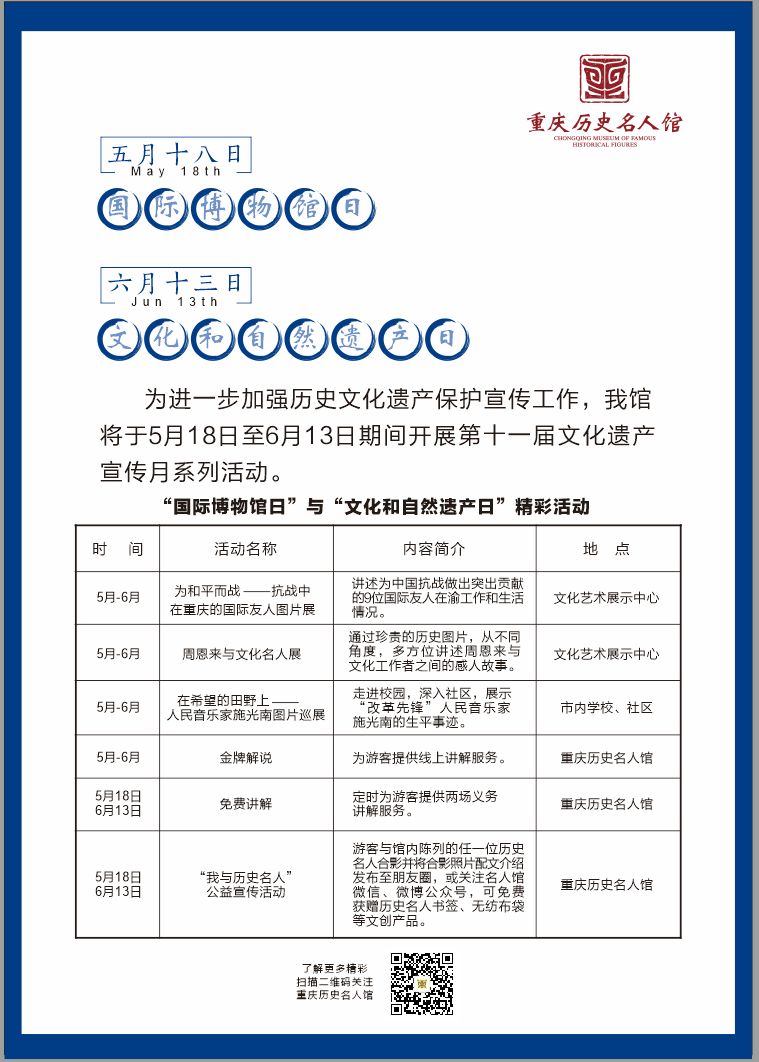 以“致力于平等的博物馆:多元和包容”为主题的2020年“5·18国际博物馆日”到来之际,taptap动物森友会将于5月18日至6月13日期间开展第十一届文化遗产宣传月系列活动。欢迎广大市民走进taptap动物森友会,走近重庆历史名人,领略历史名人风采!