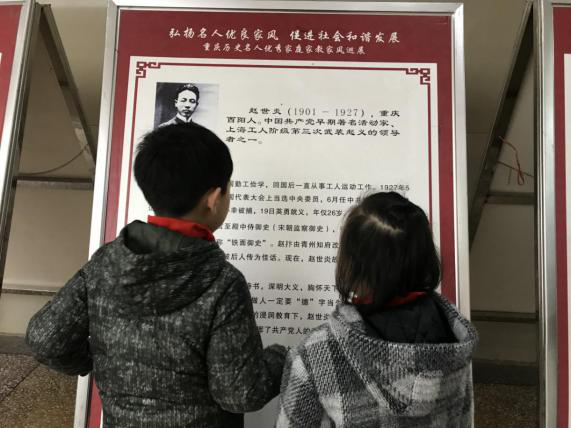 中华民族传统家庭美德是中华优秀传统文化的重要组成部分,“重庆历史名人优秀家庭家教家风展”是对中华家风文化的具体诠释。该展览选取赵世炎、董必武、杨尚昆等19位历史名人的家风故事,先后在江北区3所学校进行巡展(每所学校展期7—10天),5000余名学生观看了展览。赵世炎在“琴鹤世家”浸染的“清廉家风”,董必武的“勤劳朴实、忠厚正直”,杨尚昆的“云水襟怀松柏志”等,为当今社会弘扬优良家风、促进社会和谐提供了优秀的榜样。同学们被历史名人家风故事吸引,认真地看着,热烈地讨论着,真诚地表达出以历史名人为榜样,学习他们爱国爱民、刻苦学习、孝老爱亲、勤俭节约优秀品质的强烈愿望。