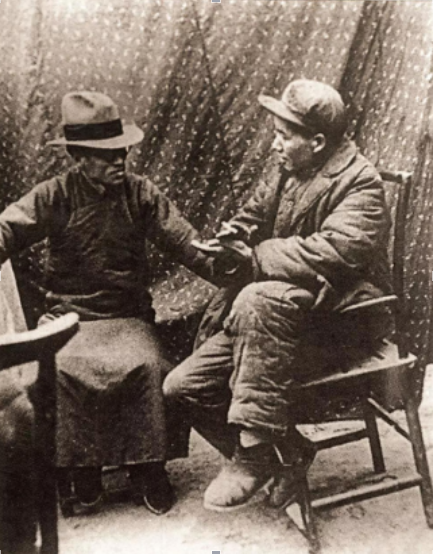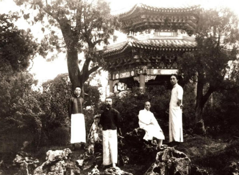 梁漱溟与北大同事在中山公园合影。左起为雷国能、李大钊、梁漱溟、张申府。梁漱溟与李大钊是“至熟至熟之友”,“在北大七八年间独与守常相好”。