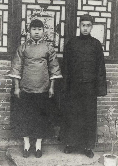 1921年夏,梁漱溟在济南做“东西文化及其哲学”演讲后回京,经伍庸伯先生介绍与黄靖贤女士订婚。图为1921年冬末,梁漱溟、黄靖贤于北京崇文门外缨子胡同老宅内新婚后的留影。