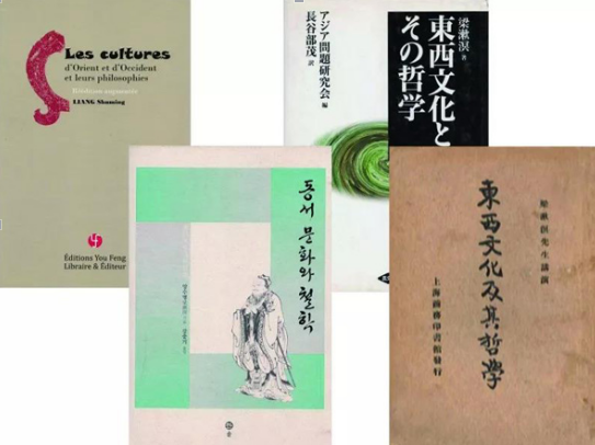 1922年1月《东西文化及其哲学》改由商务印书馆出版,至1929年已经再版发行八版。该书的出版将五四时期关于东西文化问题的论战推向一个新的高潮,“他这部书,居然翻成了十二国的文字,把东西两半球的学者,闹个无宁日。五年之内同他通讯的信札有五千以上”(李石岑语)。图为《东西文化及其哲学》题记说明及中文、法文、韩文、日文版的封面。