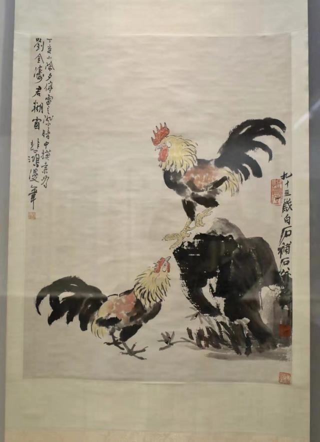 展览展出了徐悲鸿1938年所作的一幅《奔马》,为了祝贺齐白石78岁高龄得子,徐悲鸿画了这幅千里驹相赠。另有一幅1947年的《竹石雄鸡》由两人合作,徐悲鸿画鸡,齐白石补石头兰草。