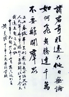 ▲黄炎培为毕业生题词:诸君前程远大,他日无论如何飞黄腾达,不要离开群众