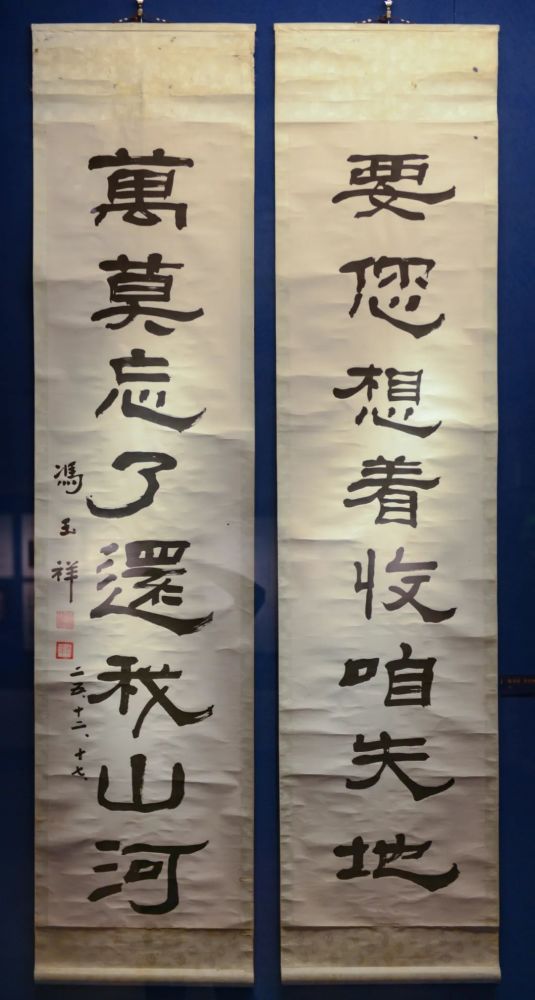 在安徽博物院收藏的众多的书法作品中有一件十分珍贵的冯玉祥隶书对联。上联是“要您想着收咱失地”,下联写“万莫忘了还我山河”,落款是“冯玉祥,(民国)二十五(年)十二(月)十七(日)”。这副对联表达了冯玉祥将军号召全国军民同心,消灭日本侵略者的决心。