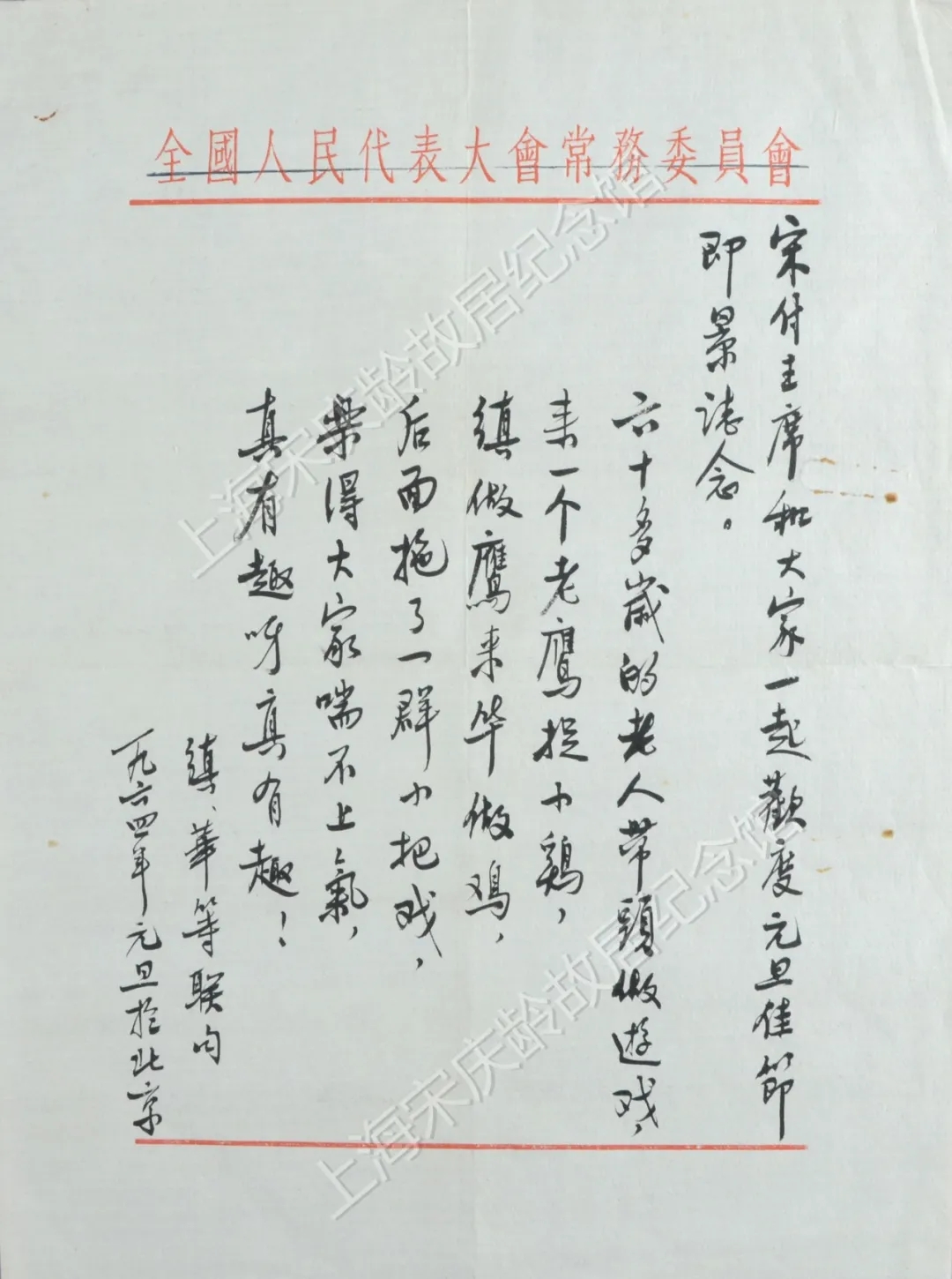 宋庆龄和蔼亲切、平易近人,每逢节日,她经常邀请朋友和工作人员及其家人到家中欢聚。1964年元旦,时任国家副主席的宋庆龄在北京寓所亲自为来寓所参加欢度元旦的职工子女打红蝴蝶结,观看职工和他们子女们的娱乐游戏。上图即为沈粹缜(曾任中国福利会托儿所所长)和黎沛华(曾任宋庆龄文字秘书)等人根据当时大家的游戏场景所写的联句,联句内容为:“宋副主席和大家一起欢度元旦佳节,即景志念 六十多岁的老人带头做游戏,来个老鹰捉小鸡,缜做鹰来华做鸡,后面拖了一群小把戏,乐得大家喘不上气,真有趣啊真有趣”。联句记录了节日里宋庆龄与友人在家做游戏的生动场景,洋溢出浓浓的节日喜气和欢乐之情。