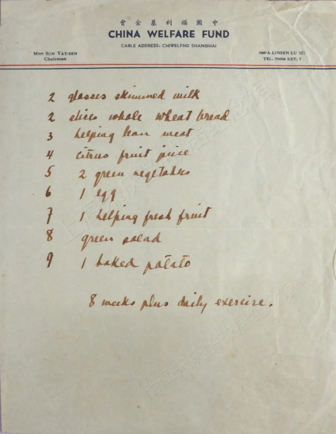 宋庆龄的饮食习惯受中西两种文化的影响,在美国留学的经历让她养成了许多西式的用餐习惯。上图这张食谱中,宋庆龄为自己规定了“两杯牛奶、两片白面包、一客火腿肉、橙汁、两种绿叶蔬菜、一个鸡蛋、一客水果、蔬菜沙拉和烤土豆”等食品,并写有“八周加上每天锻炼”的字样。既注重饮食的营养搭配,又重视运动锻炼,由此展示了宋庆龄健康的生活方式。食谱写于“中国福利基金会”机构的信纸上。
