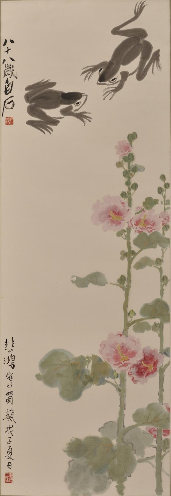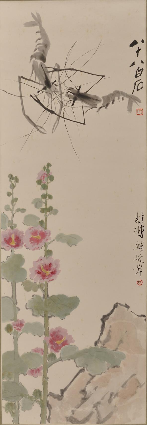 从徐悲鸿、齐白石1948年合作的《蜀葵蛙》与《蜀葵虾》看,两幅两对蜀葵作对称状,且高度与构图极为相仿,形态带有西画式的写实,,兼工带写,很可能是徐悲鸿先生为自己的住处——东受禄街“蜀葵花屋”而作的一对条屏在先,白石翁来访徐宅时受邀补笔在后,所以齐白石先生大胆在上端处补蛙和补虾,似有意对蜀葵共寓“好事成双”之意。而后,悲鸿先生可能为了打破这对条屏构图的过于对称,在右幅补岸石,所以落款“悲鸿补近岸”。