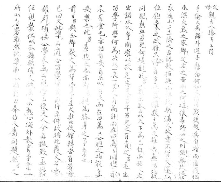 不得手諭久矣。海外游子,懸念何如?又聞川戰復起,兵自增而匪復狂!水深火熱之家鄉,父老之苦困也何堪?狼毒野心之列強無故侵佔我國土。二十一條之否認被拒絕,而租地期滿又故意不肯交還。私位飽囊之政府,隻知自爭地盤,擁數十萬之雄兵,無非殘殺同胞。熱血男兒何堪睹此?男也,雖不敢以天下為己任,而拯父老出諸水火,爭國權以救危亡,是青年男兒之有責!況男遠出留學,所學何為?決非一衣一食自為計,而在四萬萬同胞之均有衣食也。亦非自安自樂以自足,而在四萬萬同胞之均能享安樂也。此男素抱之志,亦即男視為終身之事業也!……