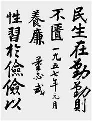 作为党和国家的领导人之一,在工作中,董必武廉洁奉公,严于律已;在生活和家庭方面,他也一直保持着艰苦朴素、勤俭清廉的优良作风。董必武曾题写过这样一句话:“民生在勤勤则不匮,性习于俭俭以养廉。”这正是他淡泊、简朴的生活写照。他在土地革命战争时期置办过一个针线包,战斗间隙用来补衣修鞋,建国后仍保存在家中。一条毛巾先用来洗脸,旧了就用来擦手,再破旧了就中间剪开两头接上用来擦脚。他喜欢书法,工作、会议之余经常练字,可他从不肯用白纸、宣纸,总是用些旧报纸,大楷写了写中楷,中楷缝里插小楷,把一张报纸写得密密麻麻。他的另一爱好是作诗,从1939 年到1975 年,共写诗1300 余首,这些诗的草稿都写在旧信封、旧日历、过时的请柬及各种形状的废纸上。他用的毛笔,笔头掉了也舍不得扔,用胶粘在笔杆上,或用线捆在笔杆上继续使用。身边的工作人员见状,劝他扔掉旧笔,他却解释说:“一支笔,一片纸,一把牙刷,不值多少钱。可是,我们是一个几亿人口的大国,每个人浪费一点,几亿人加到一起决不是个小数字。社会财富,大家都要爱惜呀!”